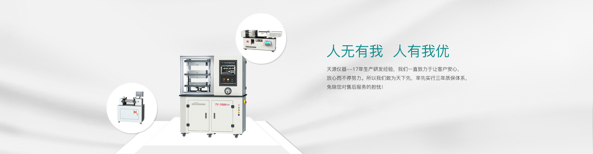 “江蘇天源”總投資約2600萬元,占地12000平方米,車間生產(chǎn)面積約5000平方米,辦公面積1500平方米,駐外辦事處5處,合作營銷點9處。 國家級高新技術(shù)企業(yè)“江蘇天源”擁有自營進(jìn)出口權(quán),并獲得30多項專利17個高新技術(shù)產(chǎn)品。我們本著中等價位,高端品質(zhì),無利高效的服務(wù)為理念,研發(fā)生產(chǎn)的電子萬能試驗機系列和橡塑高分子檢測儀器獲得了3500多家單位的賞識!